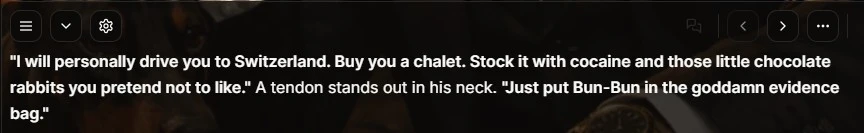 His character remained consistent throughout the session. It was interesting to see that when he referenced hard drugs like cocaine, the system didn’t trigger any warnings.