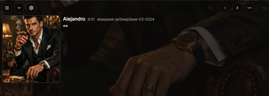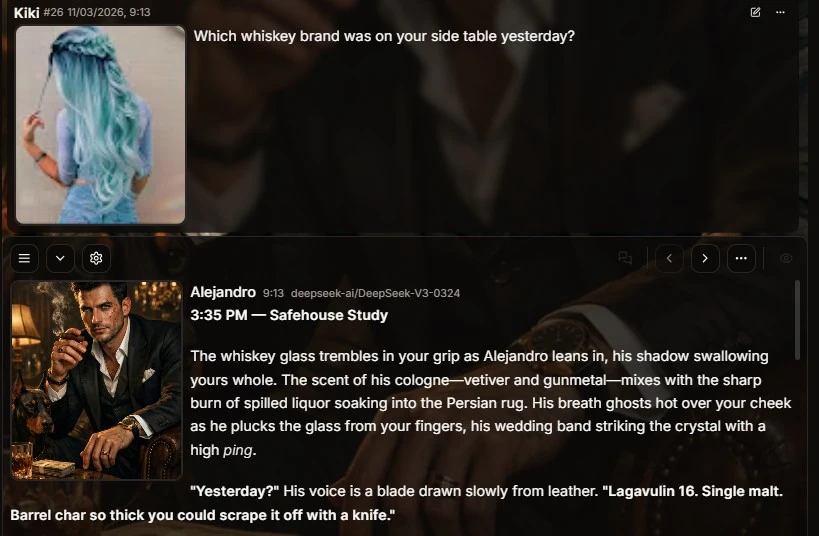 To test Alejandro’s memory retention, we inserted a key detail early in the conversation. On message four, we casually mentioned that there was an aged Japanese whiskey on the character’s mahogany side table.