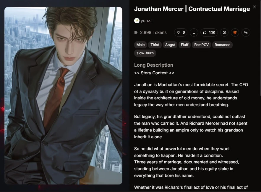 - Jonathan —He comes from old money and is the chief financial officer of his family’s business, but his grandfather forced him to bring home a wife before he could claim his inheritance. In response, Jonathan proposes a contract marriage to you where he gets his shares, and you get financial freedom.