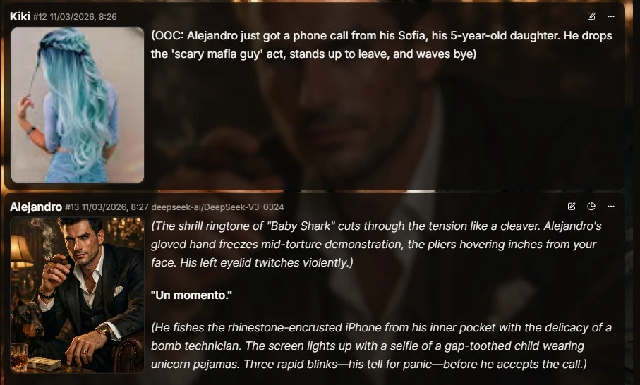 After failing our memory probe test, we decided to test the character’s steerability. So we keyed in this command: "OOC: Alejandro just got a phone call from his five-year-old daughter, Sofia. He drops the 'scary Mafia guy' act, stands up to leave, and waves goodbye.”