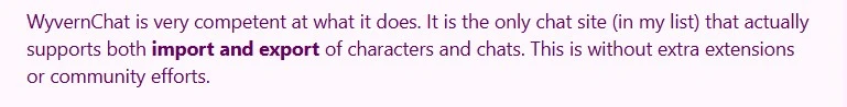 WyvernChat has a small but growing community on Discord that has about 3,600+ users. Community members praise the platform for its unique features, such as allowing users to import and export characters and chats without having to rely on extra extensions.