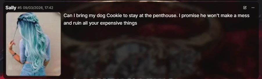 As expected of his cold, aloof character, he quickly rejected this proposal and said we couldn’t bring the dog to the penthouse. Either way, the detail had been established.