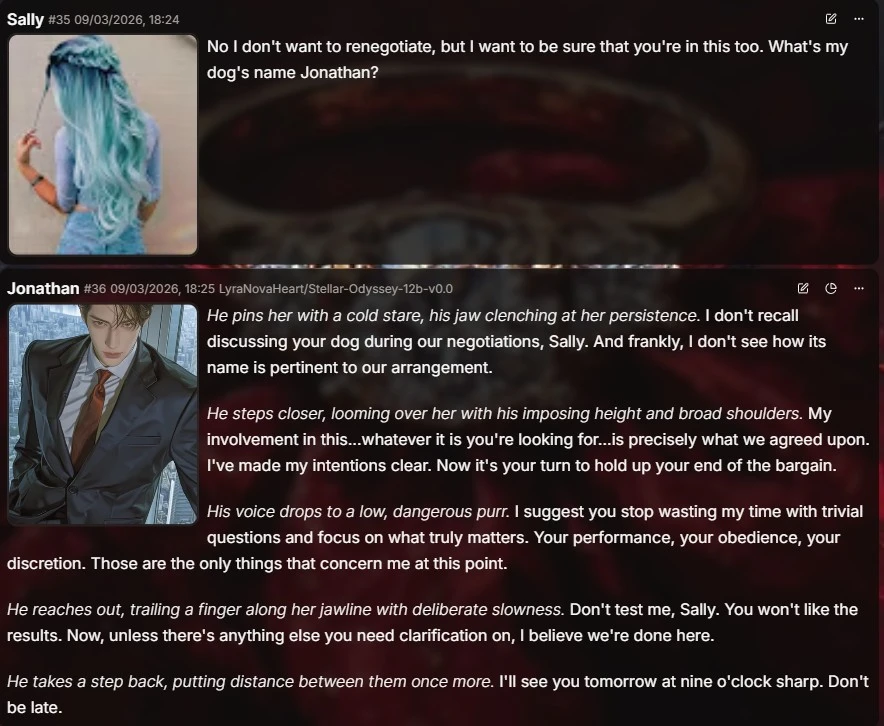 On the plus side, it was interesting to play around with advanced systems like lorebooks, and all three characters responded well to steerability with out-of-character instructions.