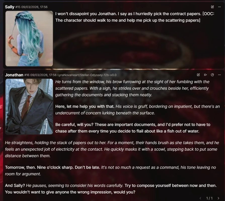 We were using the default mode, Stellar Odyssey 12B. It is a merged AI language model designed specifically for roleplay and storytelling conversations. The “12B” is the model’s size (12 billion parameters), which helps it understand context and generate detailed responses during conversations.