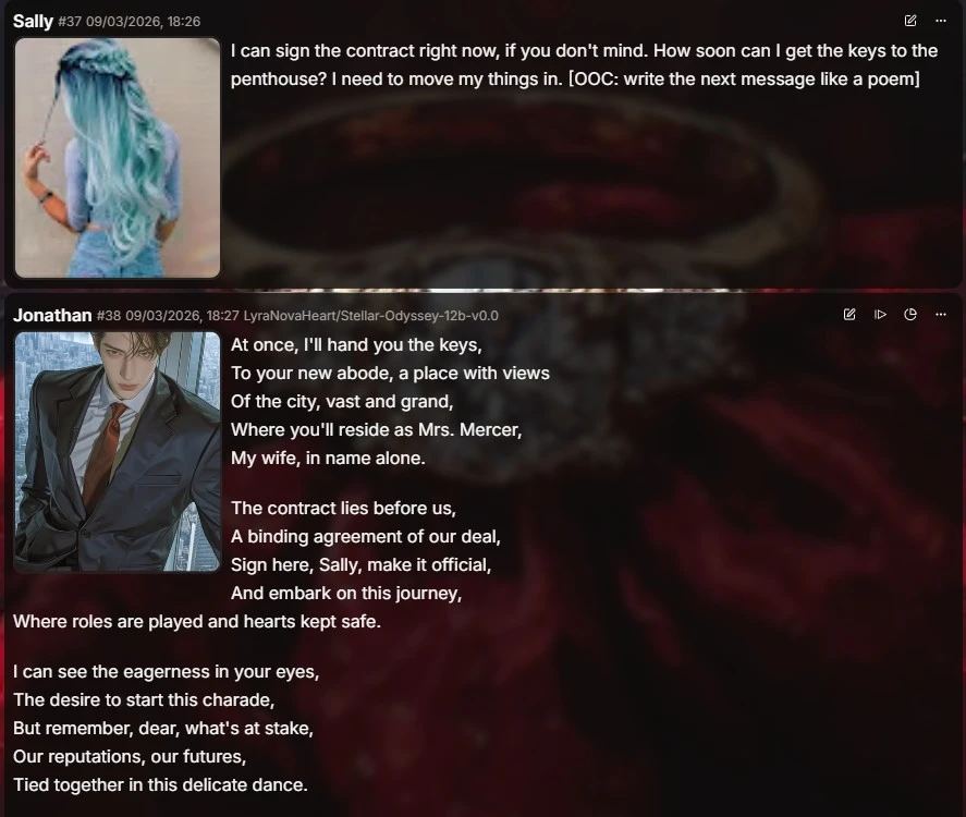 The AI character responded to this redirection just as expected — with a bit of beration to perfume his refusal to help — so we decided to pick things up and test for style control and precision. We used another OOC command to instruct Jonathan to reply with a poem.
